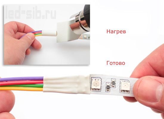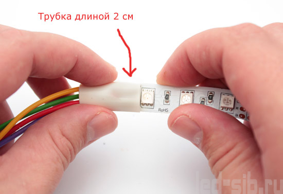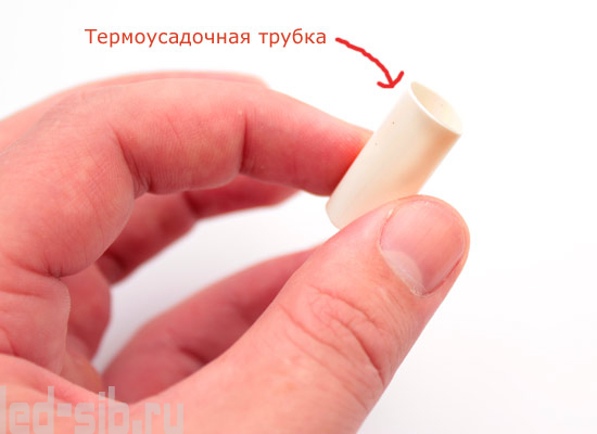 Принцип ее действия заключается в том, что при нагревании она значительно уменьшается и плотно облегает контакты. Таким образом достигается электрическая изоляция и механическая прочность. Продают термоусадочные трубки по одному метру, стоимость метра – примерно 30 рублей (зависит от города). Для нашей ленты нужна трубка диаметром 10 мм. Итак, отрезаем маленький кусочек трубки (2 см) и одеваем его на контакты ленты.
