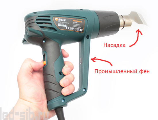 Чтобы горячая струя воздуха не вывела светодиод из строя, на сопло фена устанавливают специальную насадку. Необходимо включить фен и немного подержать напротив термоусадочной трубки. И все – она быстро нагревается. Главное в этом деле – не перестараться, поскольку горячий воздух может расплавить все светодиоды. Не забывайте об этом!