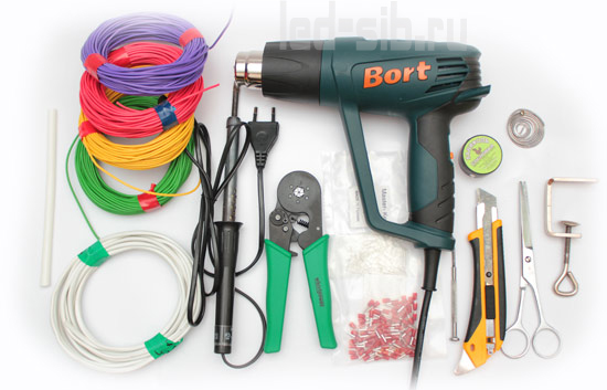 Ну, предположим, что паяльник и ножницы у вас есть. Но для дела еще потребуется промышленный фен, обжим для контактов, провода, термоусадочная трубка и куча других мелочей.