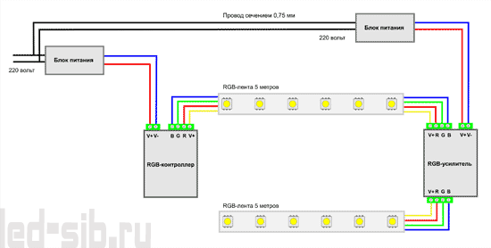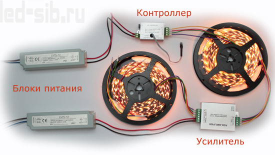 Если вы запутались в этих электрических схемах, ниже мы привели фотографию, из которой все станет понятно. Напомним об основных моментах: для подключения одной ленты нужен блок питания и контроллер, для двух и больше – нужен второй блок и усилитель.