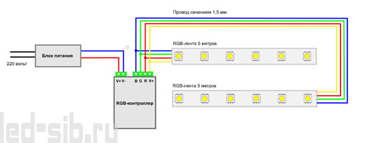 Также можно применять эту схему в случае подключения RGB-лент, которые имеют 60 светодиодов на один метр. Тогда придется использовать блок питания и контроллер с удвоенной мощностью.