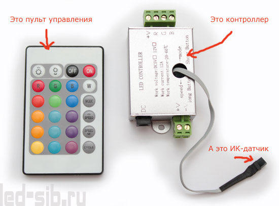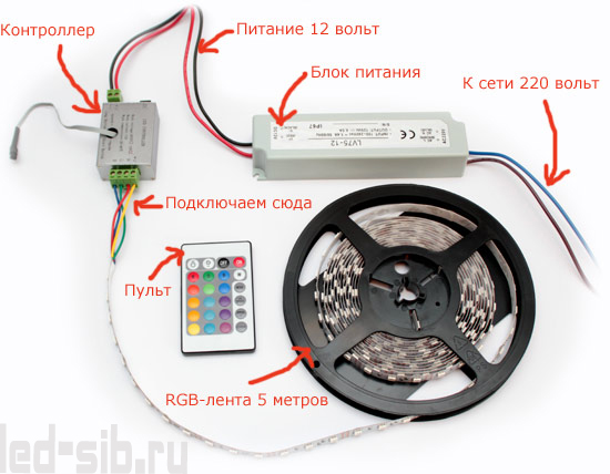 Его задача – передавать сигналы от инфракрасного датчика к контроллеру. Контроллер, в свою очередь, включает соответствующий режим освещения. Схема подключения светодиодной RGB-ленты выглядит примерно так: