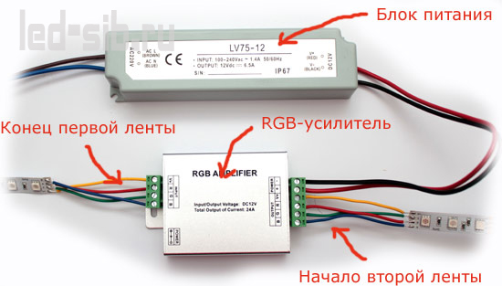 Подведем итоги. С помощью RGB-усилителя и дополнительного блока питания можно соединить две ленты (по 5 и 3 метра) и сделать одну ленту длиной 9 метров. При такой схеме подключения можно создавать светодиодную ленту любой длины.