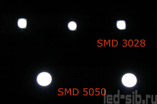 Из фотографии нам стало понятно, что светодиоды обладают примерно одинаковой яркостью. Но, технические описания светодиодных лент имеют параметр «люмен». Так вот, световой поток, излучаемый от светодиода SMD-5050, равнялся 12 люменам, а от SMD-3028 – около 4 Люмен. Из этого становится ясно, что первый светодиод выдает яркости в три раза больше второго.