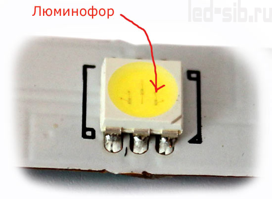 А теперь подробнее о белом цвете. Дело в том, что до сих пор ученые не смогли создать такой кристалл, который излучал бы белый цвет. Да, но как же тогда светодиодная лента излучает и белый цвет? Все достаточно просто – в таких случаях используют синий светодиод, излучающий ультрафиолет, и наносят на его поверхность слой люминофора.