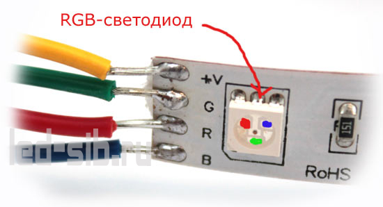 Есть еще один способ для получения белого цвета. В один светодиод устанавливаются три кристалла: красный (Red), зеленый (Green) и синий (Blue). Выполненный таким образом светодиод называется RGB-светодиодом, а содержащая их лента – RGB-лентой.