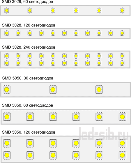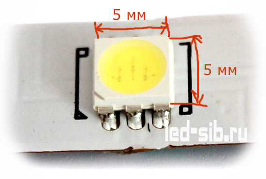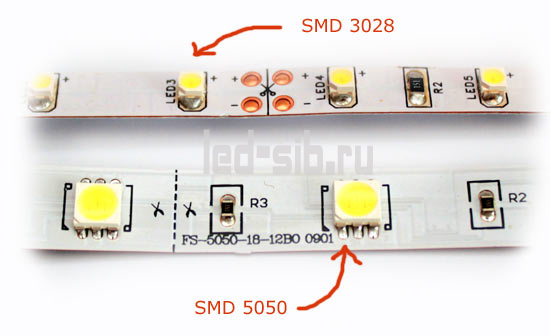 Числа 5050 и 3028 – это размеры самого светодиода (разумеется, в миллиметрах). Например, размеры светодиода в ленте SMD-5050 составляют 5,0*5,0 мм, а в SMD-3028 – 3,0*2,8 мм.